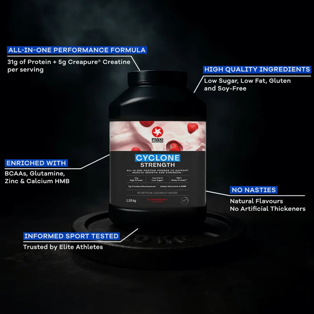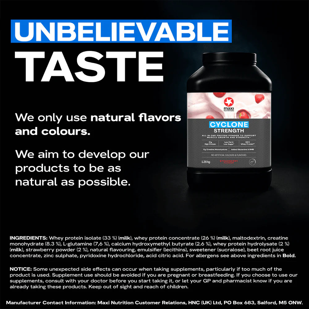 MaxiNutrition Cyclone is the UK’s trusted protein and creatine supplement, scientifically designed to help you build muscle, recover faster, and improve performance. Whether you’re an athlete, gym-goer, or serious lifter, Cyclone gives your body everything it needs after training in one powerful formula.