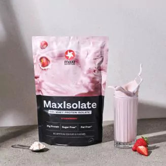 Maxi Nutrition MaxIsolate Strawberry is a high-quality whey protein isolate with natural freeze-dried strawberry powder, enriched with Vitamin B6 and sweeteners.