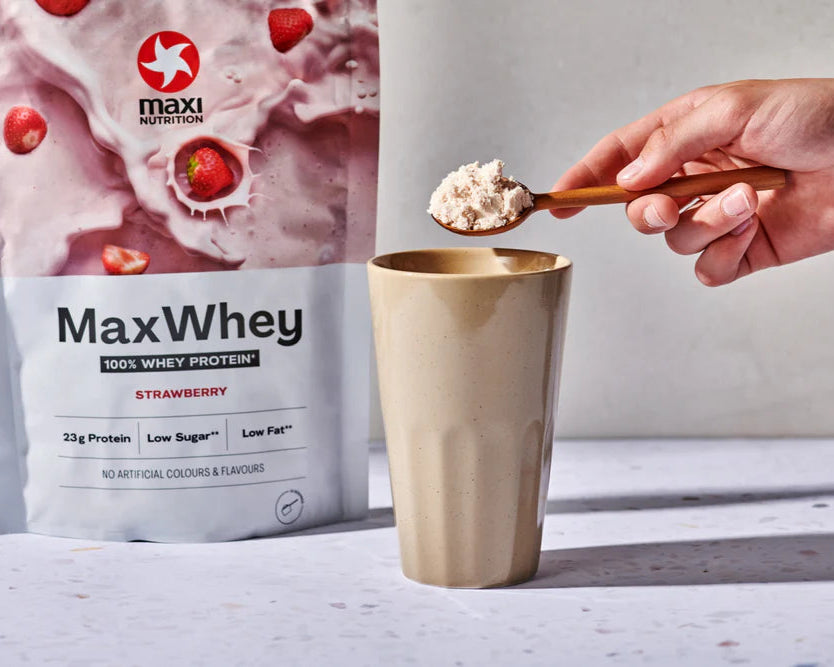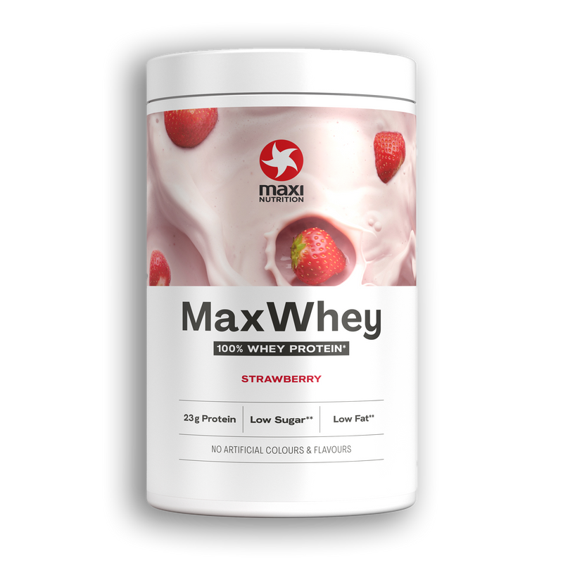Maxi Nutrition MaxWhey Strawberry is a delicious whey protein powder with natural freeze-dried strawberry flavour, enriched with Vitamin B6 and sweeteners.