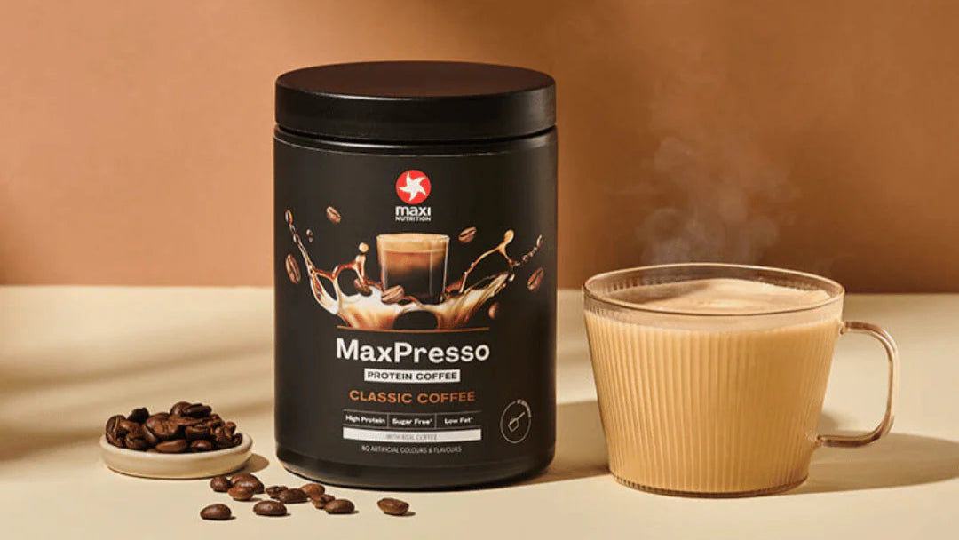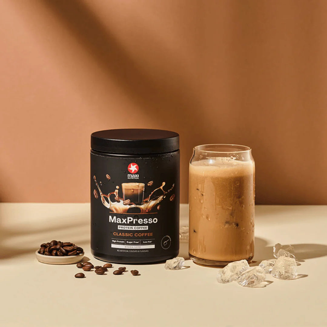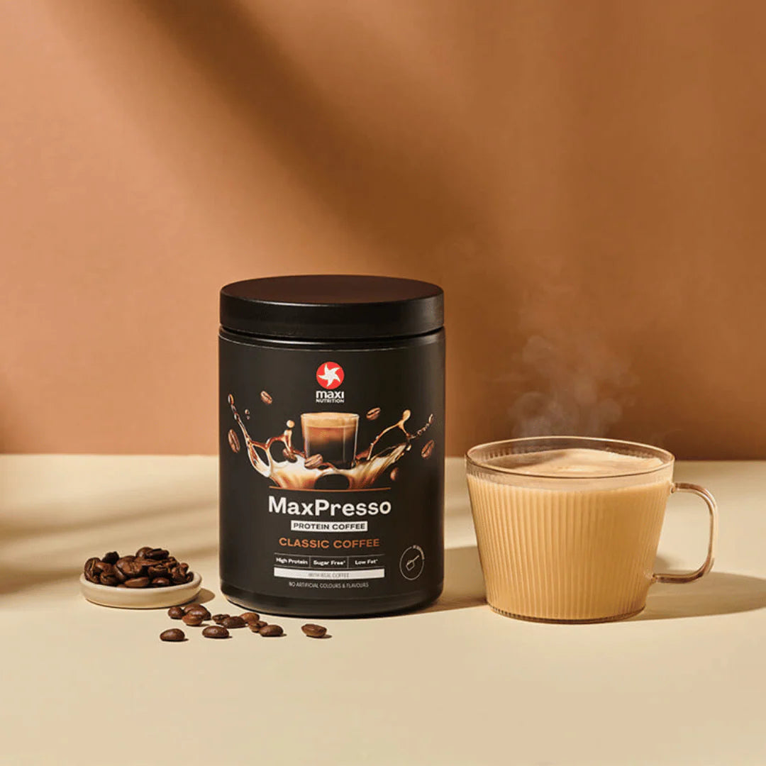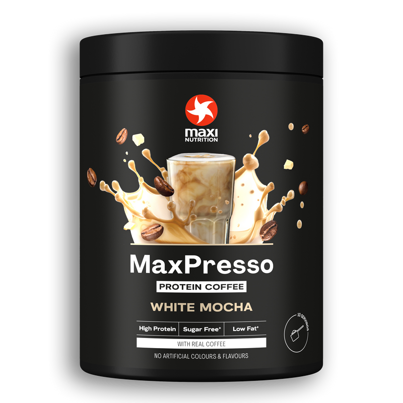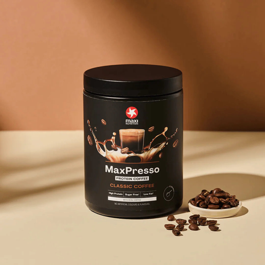 Maxi Nutrition MaxPresso Coffee is a protein-rich instant coffee drink created for athletes and active people. Combining 72 g protein per 100 g with natural caffeine, it delivers both recovery and energy in one serving.